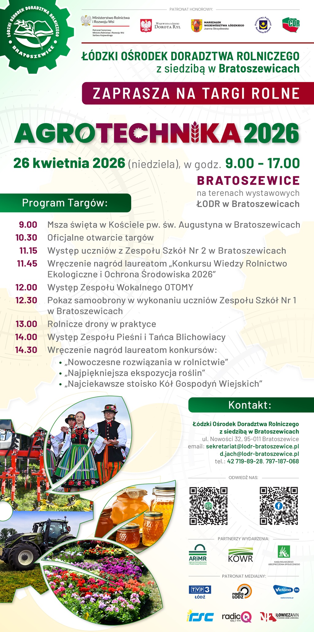 Łódzki Ośrodek Doradztwa Rolniczego zaprasza na wiosenne wydarzenie Targi Rolne AGROTECHNIKA 2026, które odbędą się w dniu 26 kwietnia 2026 (niedziela) w godz. 9.00-17.00 w miejscowości 95-011 Bratoszewice,
