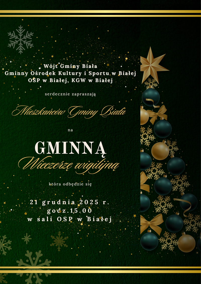 Wójt Gminy Biała, Gminny Ośrodek Kultury i Sportu w Białej, Ochotnicza Straż Pożarna w Białej oraz Koło Gospodyń Wiejskich w Białej serdecznie zapraszają mieszkańców Gminy Biała na Gminną Wieczerzę Wigilijną,