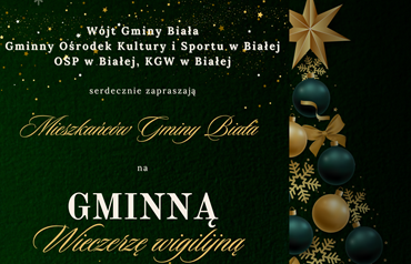 Wójt Gminy Biała, Gminny Ośrodek Kultury i Sportu w Białej, Ochotnicza Straż Pożarna w Białej oraz Koło Gospodyń Wiejskich w Białej serdecznie zapraszają mieszkańców Gminy Biała na Gminną Wieczerzę Wigilijną,