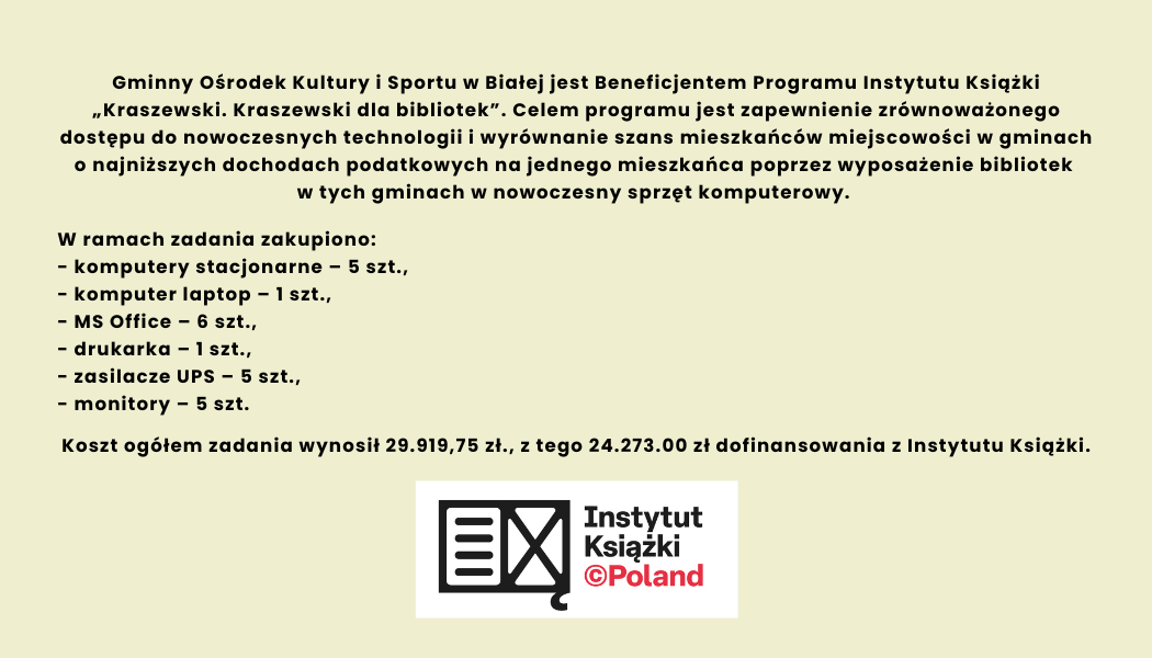 Gminny Ośrodek Kultury i Sportu w Białej jest Beneficjentem Programu Instytutu Książki "Kraszewski. Kraszewski dla bibliotek". Celem programu jest zapewnienie zrównoważonego dostępu do nowoczesnych