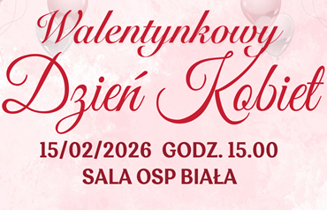 Wójt Gminy Biała oraz Gminny Ośrodek Kultury i Sportu w Białej serdecznie zapraszają na Walentynkowy Dzień Kobiet. Uroczystość odbędzie się w dniu 15 lutego 2026 r. w sali OSP w Białej. Zapisy pod Nr tel. 43 841 90 04